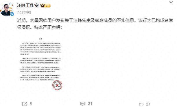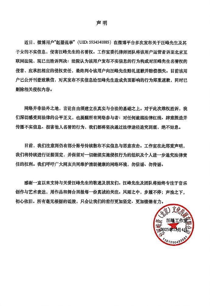 12񀙔日,@汪峰工作室 发布严正声明:近期,大量网络用户发布关于汪峰先生及家庭成员的不实信息,该行为已构成名誉权侵权。